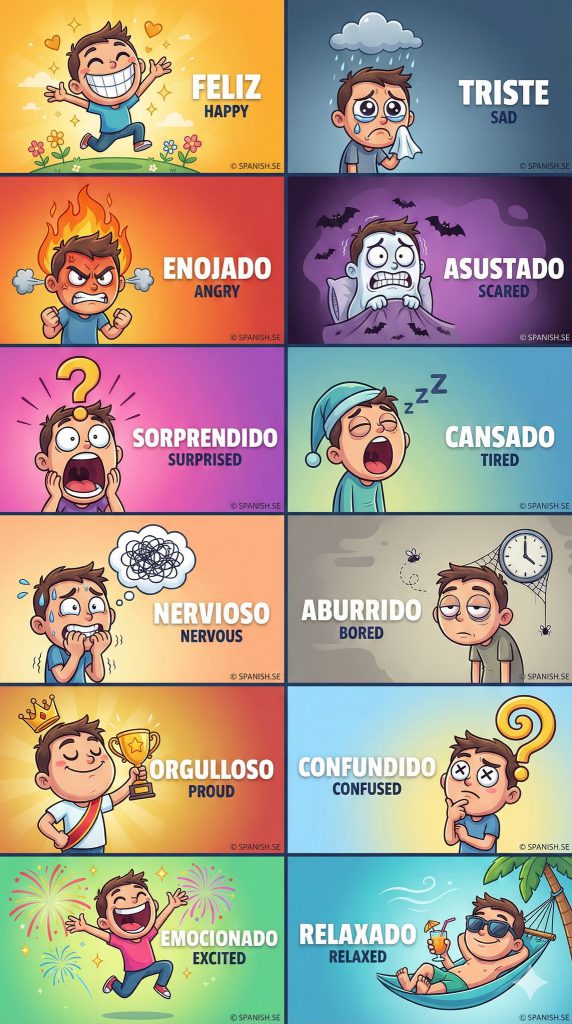 במסגרת ניסיונותיי ללמוד ספרדית, נתקלתי באיורים החמודים האלה, שמתארים ויזואלית רגשות שונים.